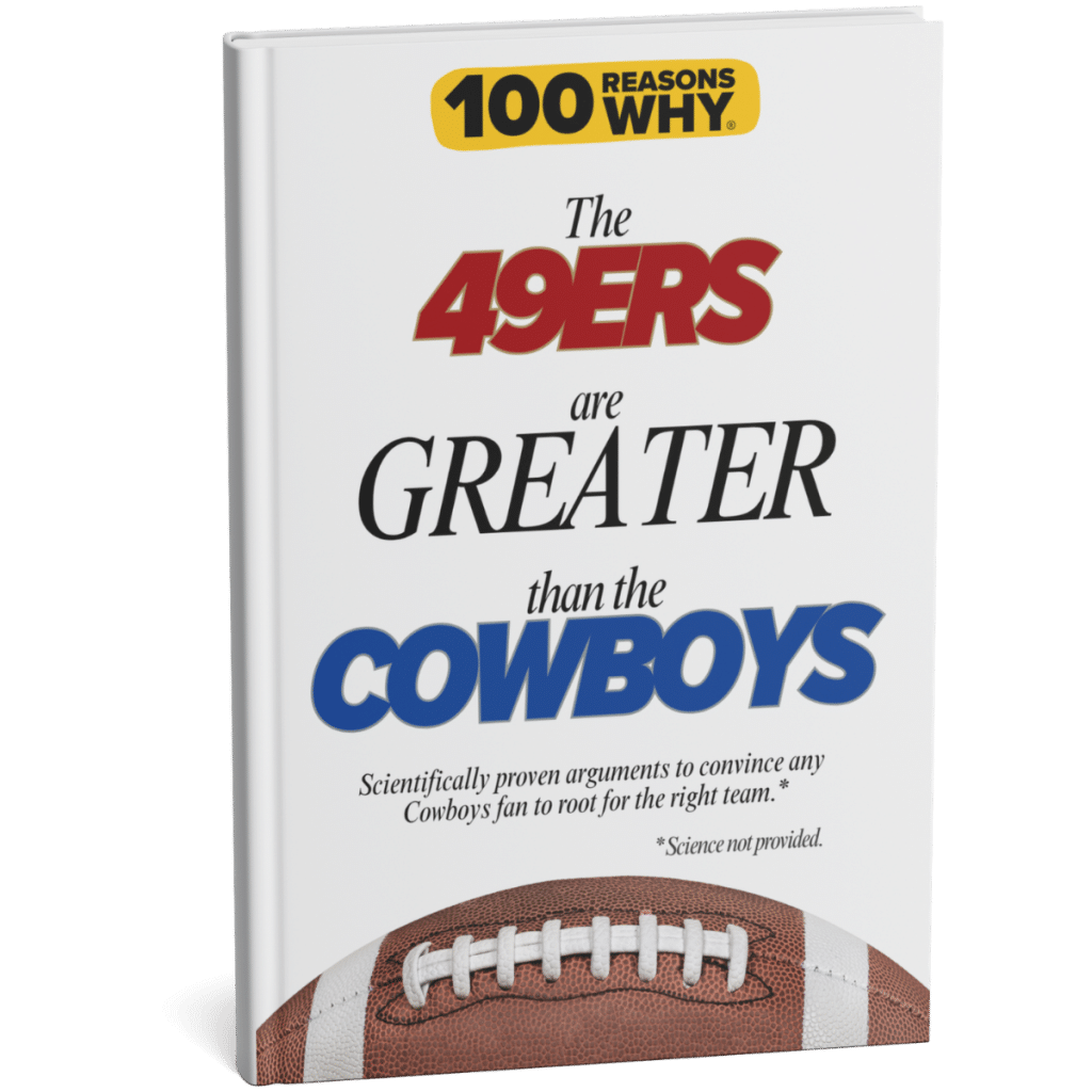Inside these pages, you’ll find one hundred “reasons” — and the quotation marks are doing Olympic-level heavy lifting — explaining why the Niners’ legacy of Montana, Young, Rice, Lott, Walsh, and a defensive lineage that hits harder than California earthquakes absolutely bodies the Cowboys’ annual tradition of January heartbreak.